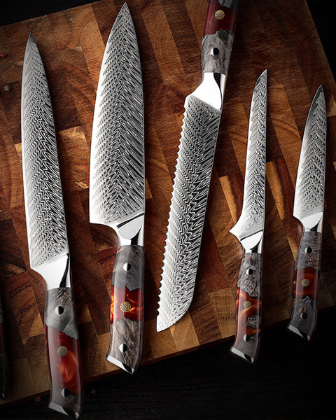 EmberSharp Series 5-Piece Knife Set – 67 Layers Damascus Steel Blades with Resin & Solidified Wood Handles